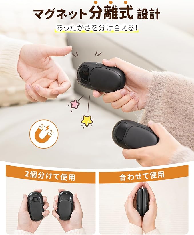 ✅【磁気式/分離式設計・2個セット】HAGOOGI電気式 カイロは合体・分離可能。両手を同時に温められますので、寒い冬を快適に過ごせる効率が、さらにアップ!2つに分けて使えるから、1台で2人が暖まれる!寒い日のデートやお出かけも一緒にぬくぬく。ハンドウォーマーとしてだけではなく、肩や足、腰など気になる部位の温めにも最適です。