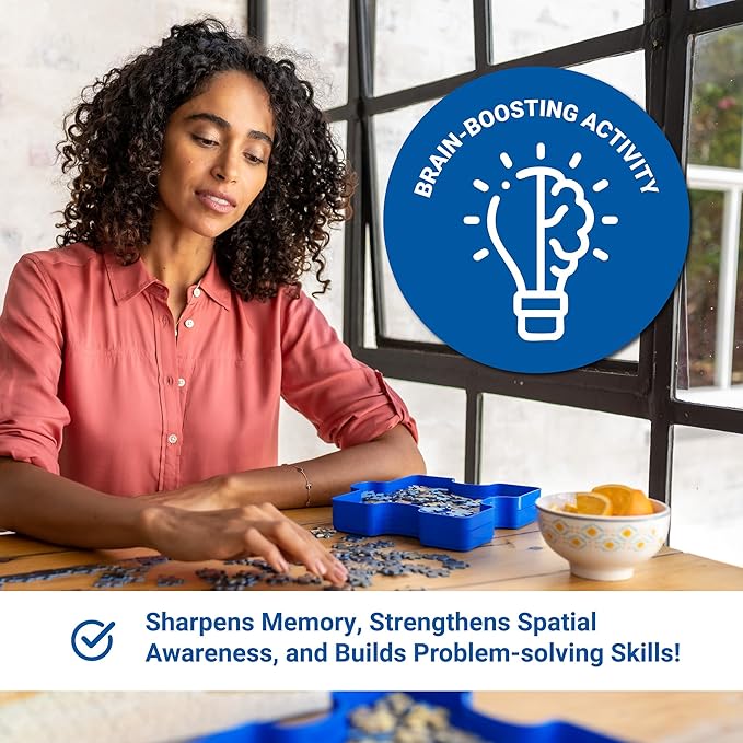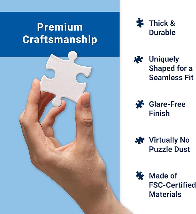 【心地良いフィット感】ラベンスバーガーのジグソーパズルは何年もかけて開発された層のない青色台紙を採用しています。適度の厚さで台紙の湾曲や劣化を防ぐとともにパズルを組み上げる際に心地良いフィット感を与えます。