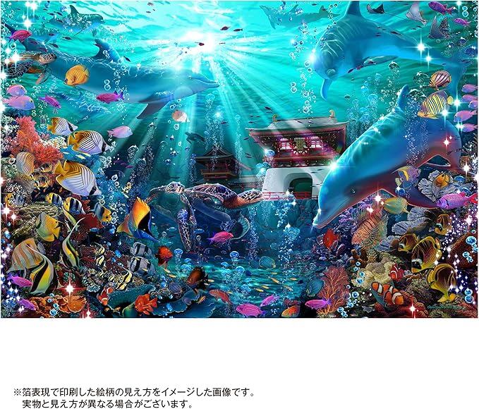ラッセンならではの美しい海の描写に、海中を彩る色とりどりの魚たちが登場し、その中を亀やイルカが舞い泳ぎます。