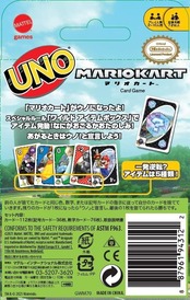 【内容】世界中で大人気のゲーム「マリオカート」がウノになって新登場。カードにはキノコやバナナ、ミドリのこうら、サンダー、ボムへいなど、特殊な効果を持ったアイテムのアイコンが入っていて、「ワイルドアイテムボックスカード」が出された場合に、その効果を発揮できるスペシャルルール。