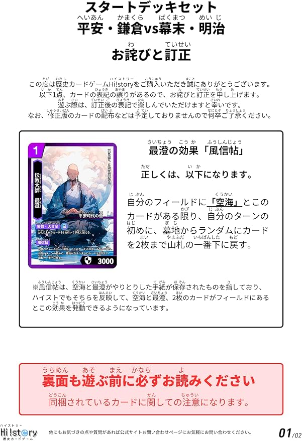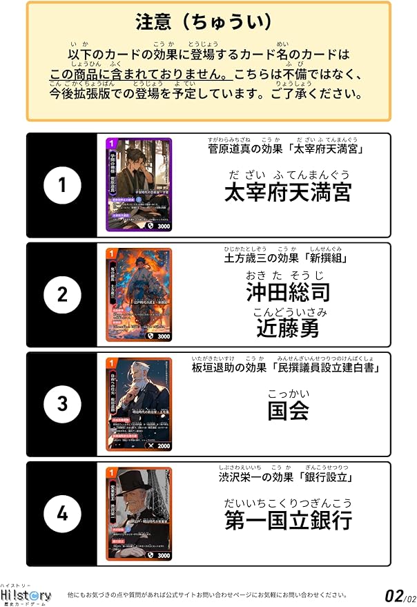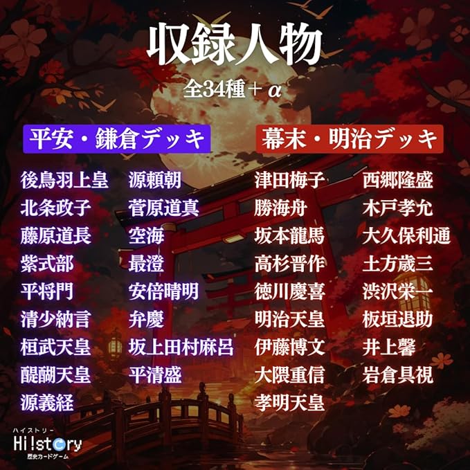 ◆内容物 平安・鎌倉デッキ 1 (32枚) 幕末・明治デッキ 1 (32枚) 説明カード (1枚) ルール説明書 (3枚) ◆収録人物一覧は公式HPからご覧ください