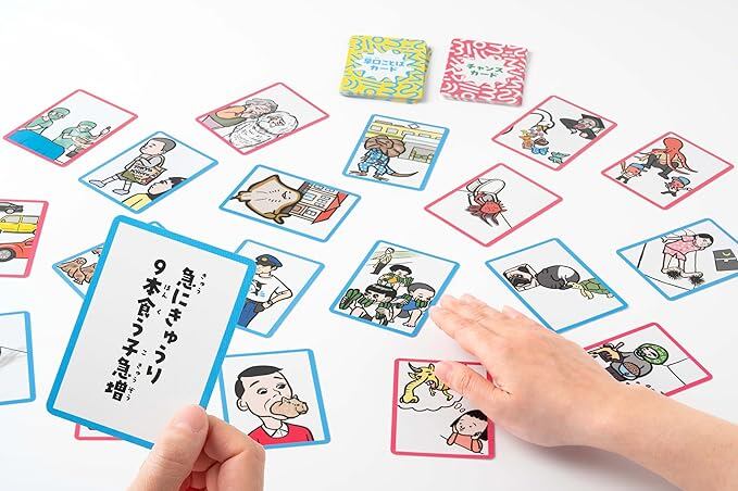 まずは、かるた取り。読み上げられた“早口ことば”に合うイラストが描かれたカードを誰よりも早く取ろう。その後、読み手と取り手がそれぞれ、お題の“早口ことば”を読んで、うまく言えたらカードをゲット。ゲーム終了時にもっとも多くの札を持っている人が勝ち。瞬発力、滑舌力、運…すべてを使って勝利をめざせ!
