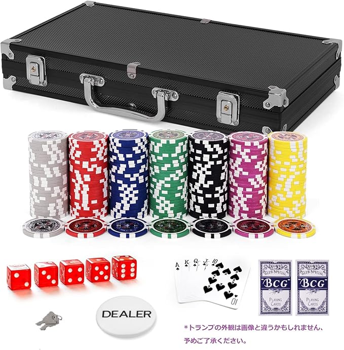 *付属品:チップ300枚+ケース1個+サイコロ5個+トランプ2組+ディーラー1個+鍵2本。