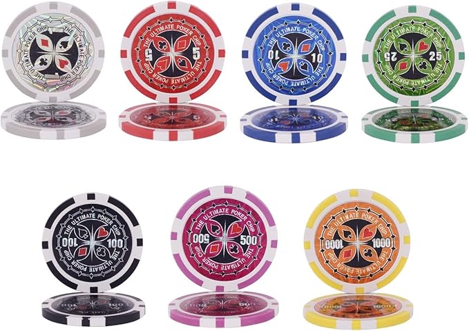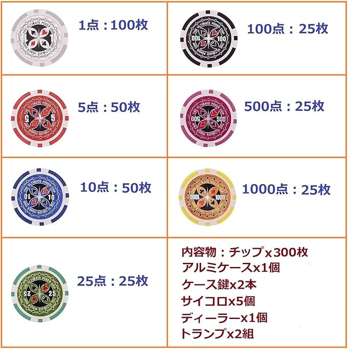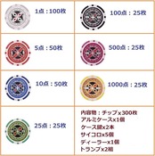 *チップ数:1点x100枚;5点x50枚;10点x50枚;25点x25枚;100点x25枚;500点x25枚;1000点x25枚。