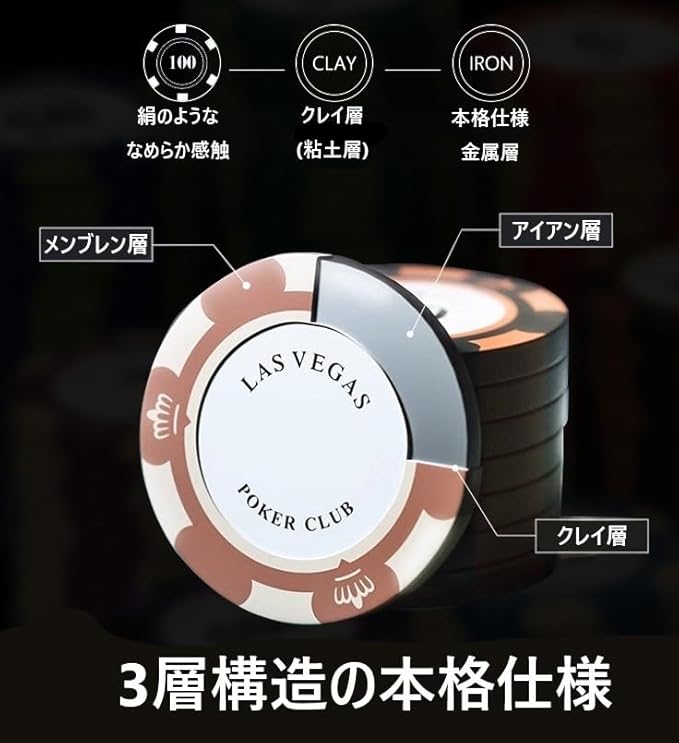 【世界基準のポーカーチップ登場】チップ1枚1枚に重みが有り、遊びなのについつい本気になってしまう。家やパーティー会場で皆で楽しく遊べる本格仕様。初心者から上級者まで幅広く遊べるように考えられたチップの枚数。コストを抑えながらより本格的に楽しみたい方にもおすすめです。 【三層連結鋳造の高級仕様(単位チップ)】 表面:メンブレン層 内側:クレイ層(粘土) 中央部:アイアン層(金属) 【水や汚れに強い本格仕様(小物チップ)】アクリル 【水や汚れに強く破れにくい(トランプ)】プラスチック製 【使い道はたくさん】カジノ、ポーカー、トランプ、麻雀、ルーレット、バカラ、ブラックジャック、 グリーンマーカー(ゴルフマーカー)、テキサスホールデム、地下スロ、地下パチ、花札、チェス、コインゲーム等々、様々な賭博、ギャンブル、ゲーム、飲み会、デート、サークルなどの遊びに使えます。 単位チップ:約 1枚あたり直径4cm、厚み3.4mm、重さ14g 小物チップ:ディーラーボタン(DEALER)約 直径約5.8cm、厚み1cm オールインボタン(ALL IN)約6cm、厚み1cm、重さ20g
