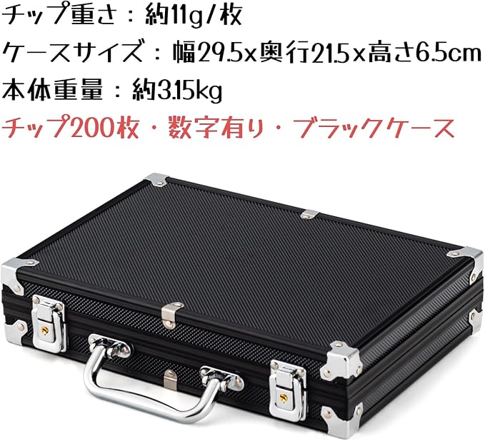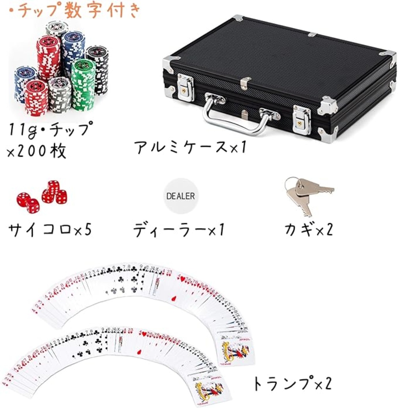 ⭐ セット内容:チップx200;アルミケースx1;サイコロx5;トランプx2;ディーラーx1;カギx2。