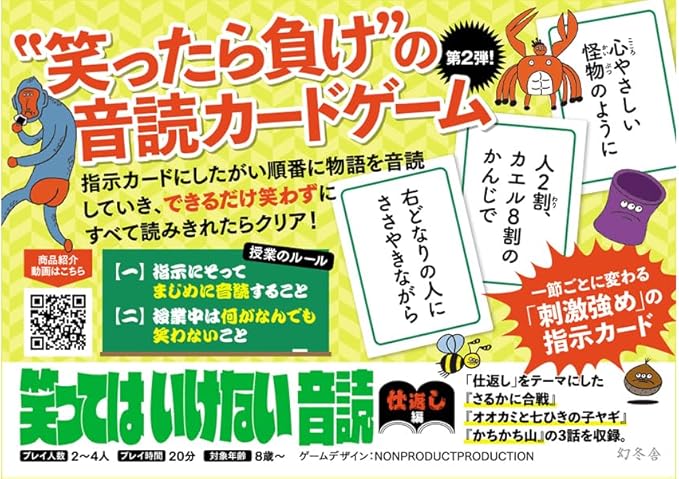 「笑ってはいけないと思うほど笑ってしまう…!」という状況をゲームにした朗読劇ゲームの第2弾! 今回は「仕返し」がテーマの童話を3話(「さるかに合戦」「オオカミと七ひきの子ヤギ」「かちかち山」)収録。指示カードには少し刺激強めのお題も?