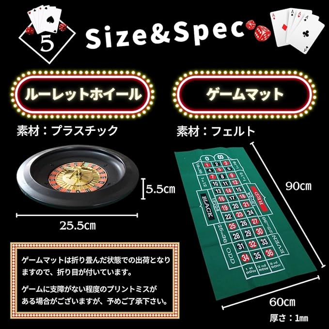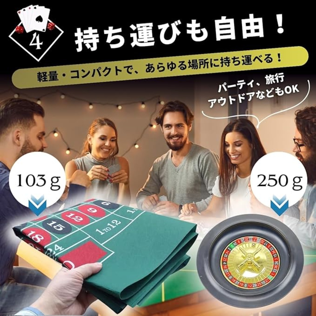 パーティーを盛り上げる最強アイテム!ゲームナイトに最適 軽量で持ち運びやすいため、どんな場所でも簡単に設置でき、友人や家族と一緒に楽しい時間を過ごせます。 【セット内容】ルーレットホイール 1点、ゲームマット 1点 【ルーレット商品仕様】素材:プラスチック、サイズ:約5.5㎝ 25.5㎝、重量:約103g、【ゲームマット商品仕様】素材:フェルト、サイズ:約90㎝ 60㎝、重量:約250g
