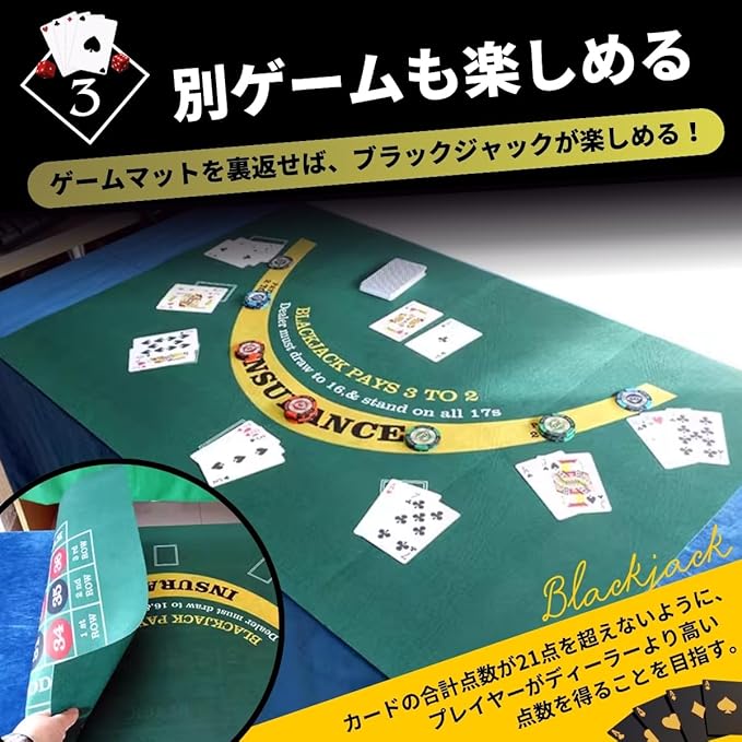 自宅がカジノに!リバーシブル仕様の本格ゲームマット ルーレットとブラックジャックの両面デザインで、気分に合わせて使い分け可能!フェルト素材を採用し、折り目が付きにくく、スムーズなチップやカードの動きを実現します。ラスベガスやマカオの本場カジノを思わせるスクリーン印刷のデザインで、臨場感たっぷりのプレイ体験を提供。ダイニングテーブルや折りたたみテーブルに敷くだけで、簡単にゲーム環境を整えられます。