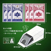 【大人数でもスムーズに遊べる!カードシュー付き6パックトランプセット】 本製品は、青と赤のトランプ6パックに加え、カードをスムーズに配れる専用カードシューが付いた実用的なセットです。カードシューを使うことで大人数でのゲームやイベントでもテンポ良く進行できます。【セット内容】トランプ6個(青3個/赤3個)、カードシュー1個【サイズ】トランプ:約9㎝ 6㎝、カードシュー:約10㎝ 25㎝ 10.5㎝