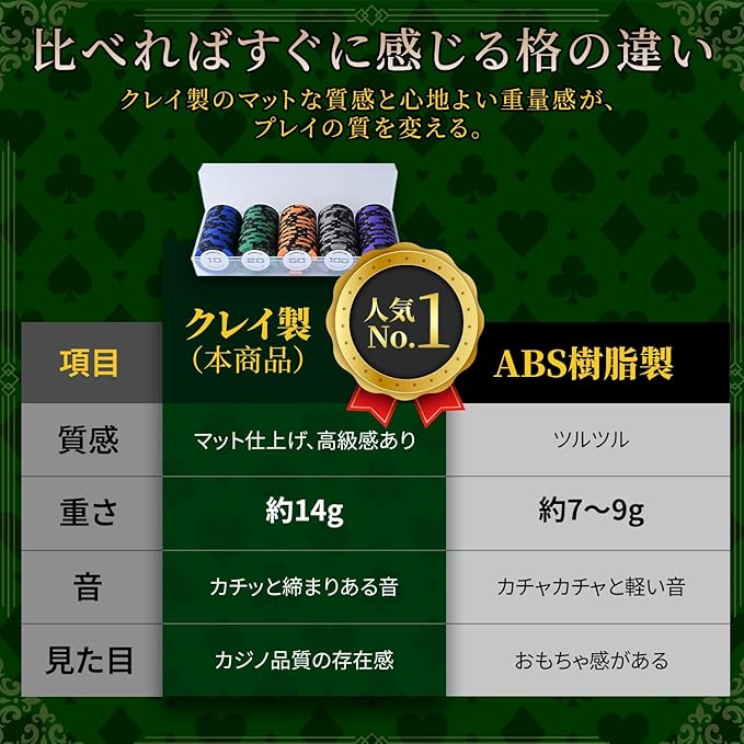 材質 クレイ製(高級感・重量感のあるポーカーチップ), プラスチック(ケース)