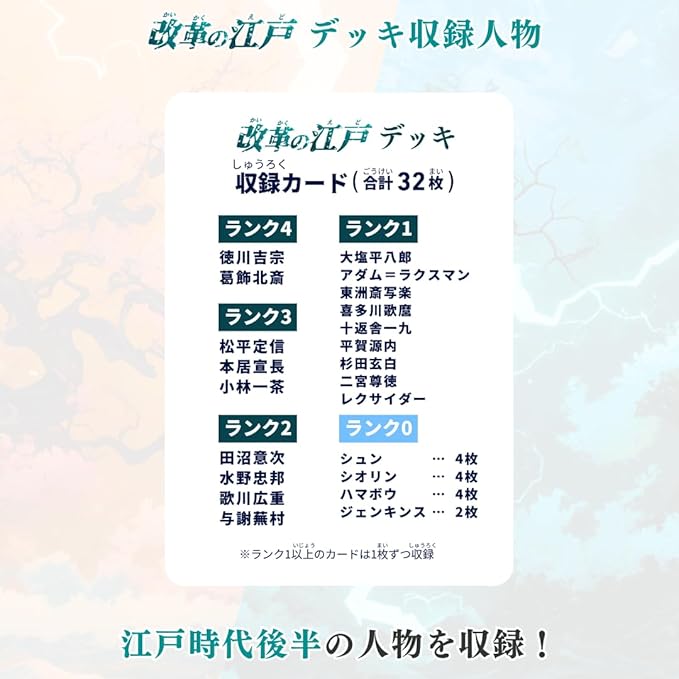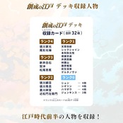◆内容物 創成の江戸デッキ (32枚) 改革の江戸デッキ (32枚) 説明カード (13枚) QRカード (2枚) 内容物カード (1枚) 収録人物カード(1枚) ◆収録人物一覧は公式HPからご覧ください