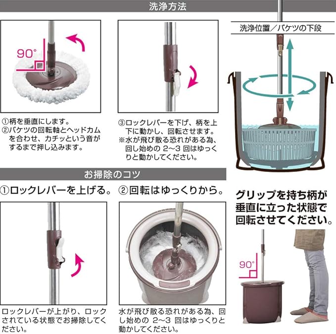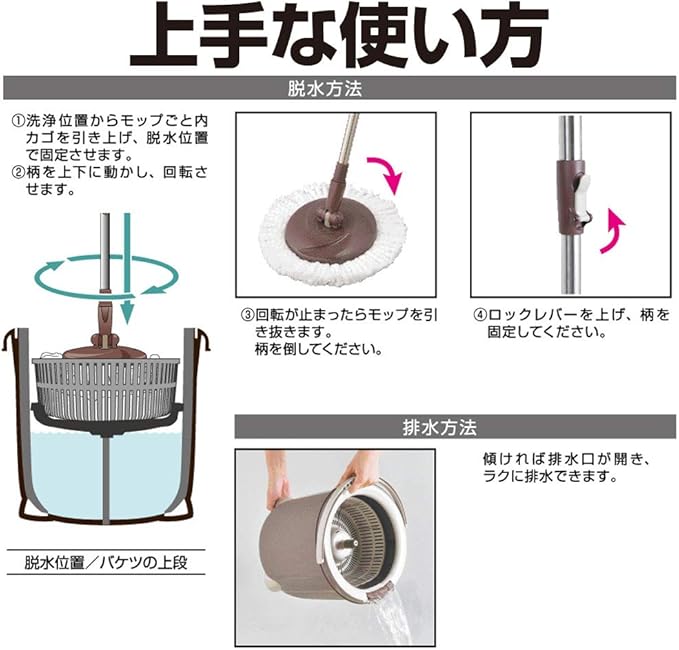 【操作ラクラク !】モップを上げるだけでモップが回転。洗浄・脱水もモップを引き上げるだけで簡単に切り替えできます。