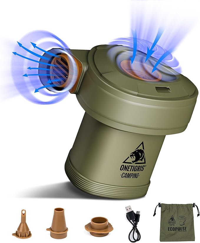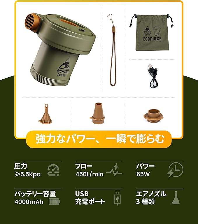 OneTigris ECOPLUSE 電動エアーポンプ キャンプ電動ポンプ Type-C充電式 450L/min 大容量4000mAh 5.5Kpa 空気入れ 空気抜き ノズルセット付き 小型 軽量 収納袋付き エアマット/浮き輪/エアーソファー/プールに対応