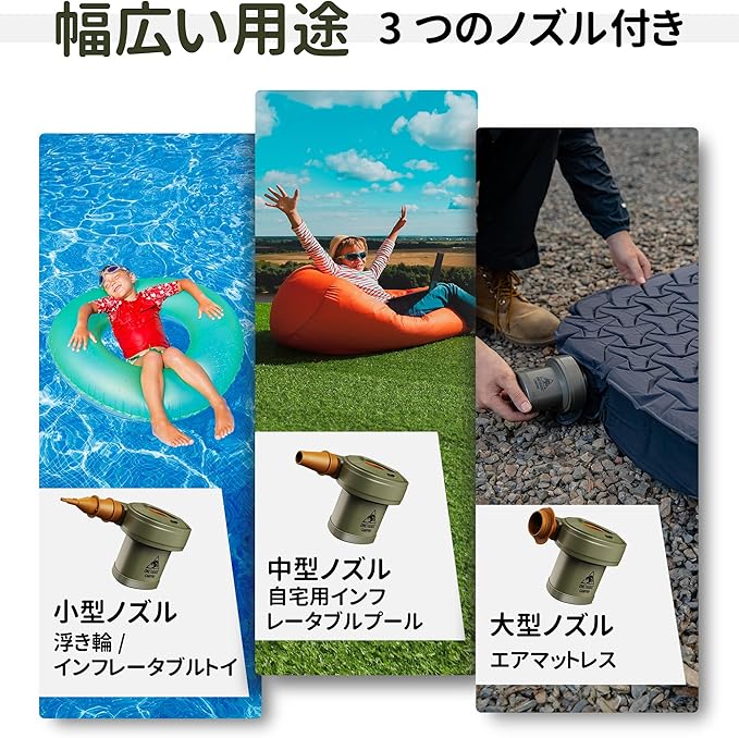 【ノズルセット付き】3つの取り外し可能なノズルを付属、ほとんどのインフレータブル製品に対応できます。エアベッド、エアソファ、インフレータブルトイ、インフレータブルプール、浮き輪などに適しています。 耐久性のあるプラスチック製で、-10℃から40℃までの温度範囲で使用可能