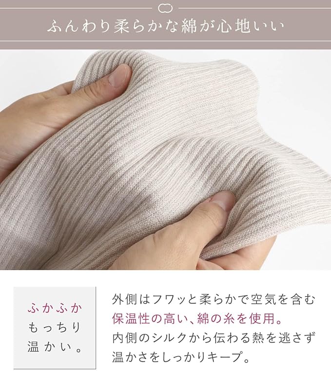 柔らかな質感と優しい光沢感のある綿糸を贅沢に使用しました。空気をよく含むので保湿効果が高く、シルクと組み合わせることにより吸汗放湿するため、蒸れることなく温かさを保ちます。