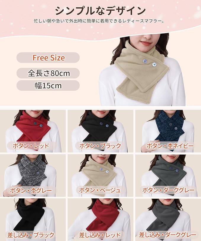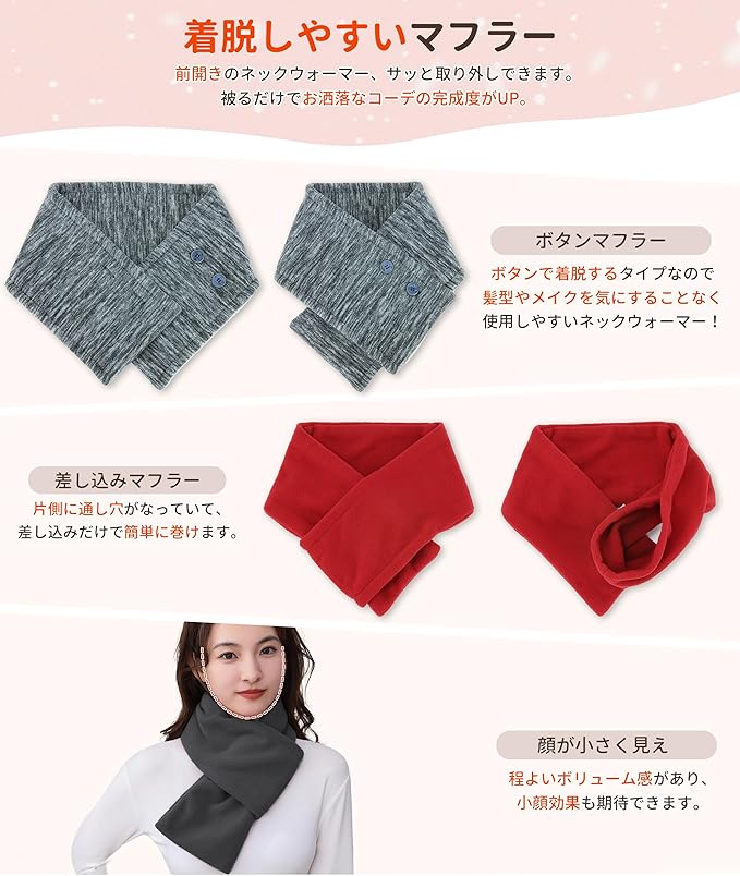 【着脱しやすい】ボタンタイプのマフラーは、前開きなのでボタンを留めたり外したりやすい。差し込みタイプのマフラーは、片側に付いていた穴で着脱しやすい。慌ただしい朝でも手軽に着こなせるレディースマフラー、お洒落なスタイルに変身しながら暖かさをキープしてくれます。しっかりと防寒してくれる上に、冬のおしゃれには欠かせない存在となっています。