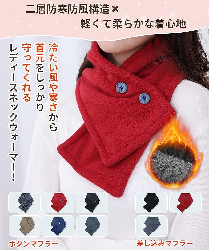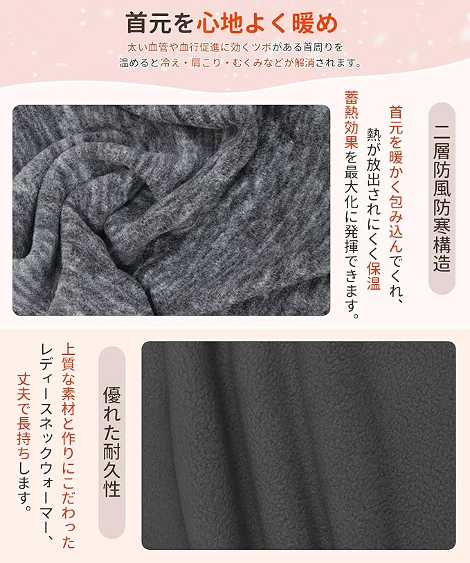 【二重防寒防風構造】厚手の二重防寒防風構造となっているレディースネックウォーマー、肌に触れてすぐにじんわりと暖かさと感じます。即防寒になる優れたマフラー、より高い保温性を発揮するよう工夫されています。サッとつけるだけで首元が暖められ、冷たい風や寒さから首元を守ってくれるレディースネックウォーマー。