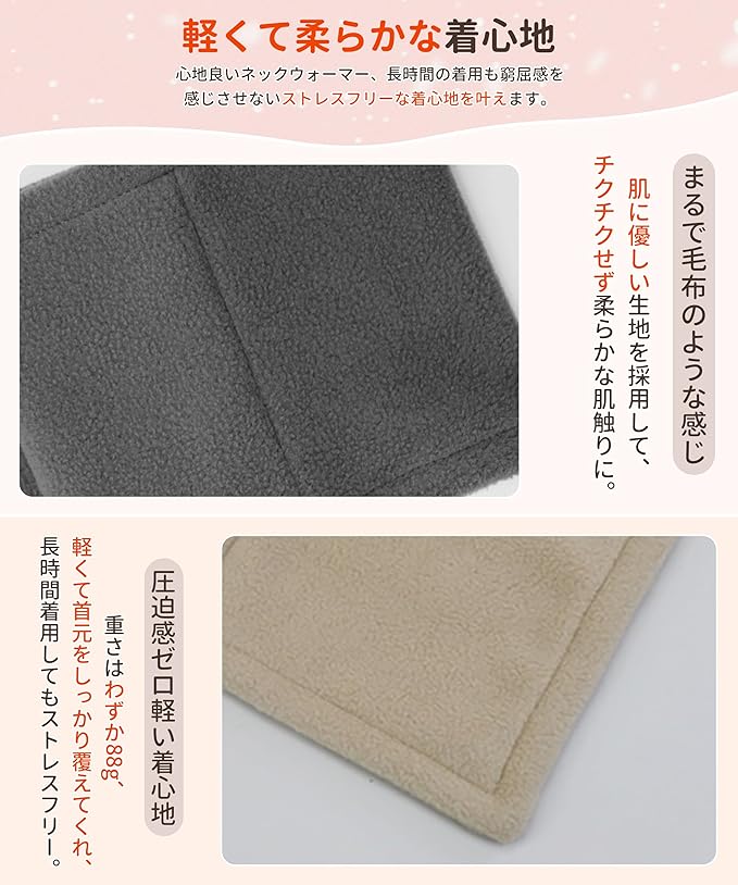 【柔らかなフィット感】こちらのレディースネックウォーマーは素肌によく馴染む素材を採用しており、まるで毛布のような柔らかな肌触りを叶えます 。優しく暖かに首元を包み込んでくれる上品な素材感を持つレディースネックウォーマー。重さは約88gのマフラー、首元への負担感がなく軽やかな着け心地を実現できます。