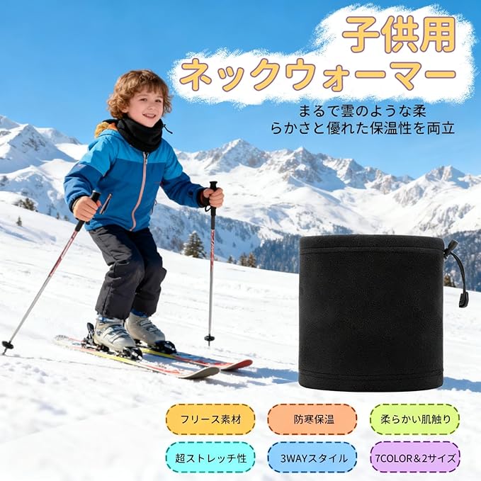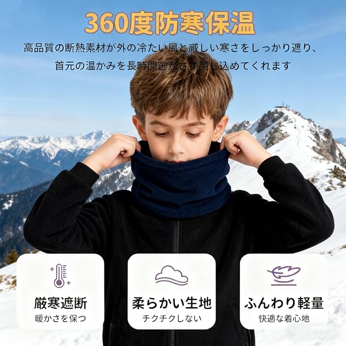 【360度防寒でしっかり保温】お子様の首元を360度すっぽりと包み込む設計で、体温で温まった空気を内部に効率よく閉じ込め、長時間にわたって保温効果を持続させるネックウォーマーです。通学路や雪遊び、スキーなど、さまざまな寒い環境で、お子様をしっかりと温かく守ります。