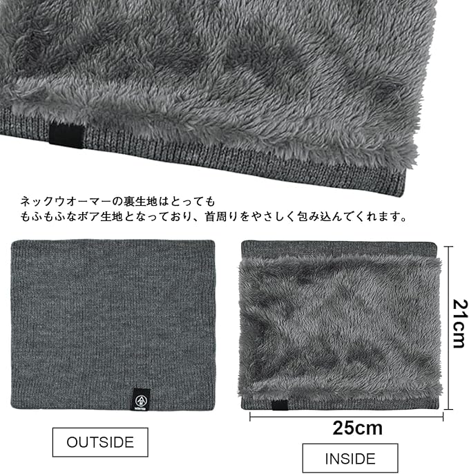 【メイン素材】 ニット。 表地はニット、裏地にはボア素材を使用しているネックガードです。身に着けた時に裏のボアが見えるデザインになっており、おしゃれに保温してくれます。