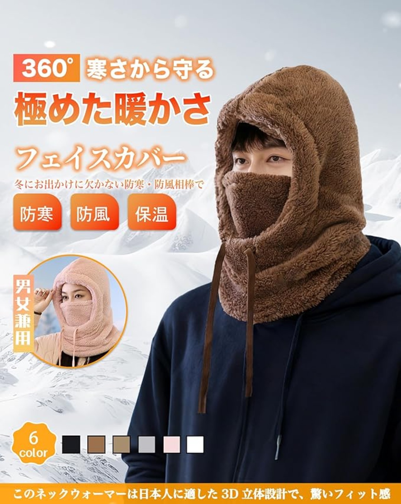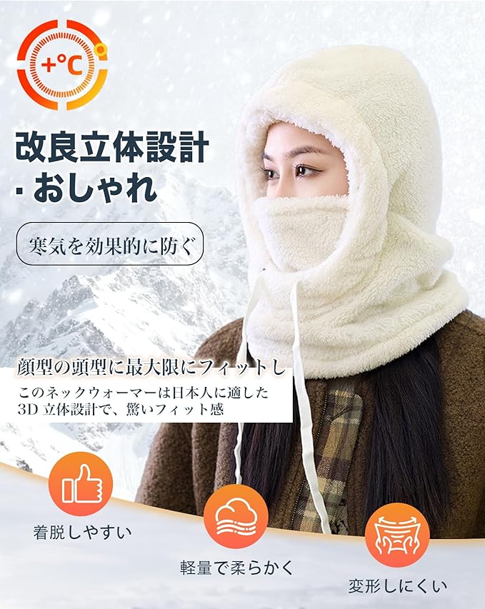 このネックウォーマーは日本人に適した3D立体設計で、驚いフィット感、首のゴム紐による調節可能なシェーピング補助で、顔型の頭型に最大限にフィットし、ネックウォーマーは保温とスタイリッシュさを兼ね備えています。