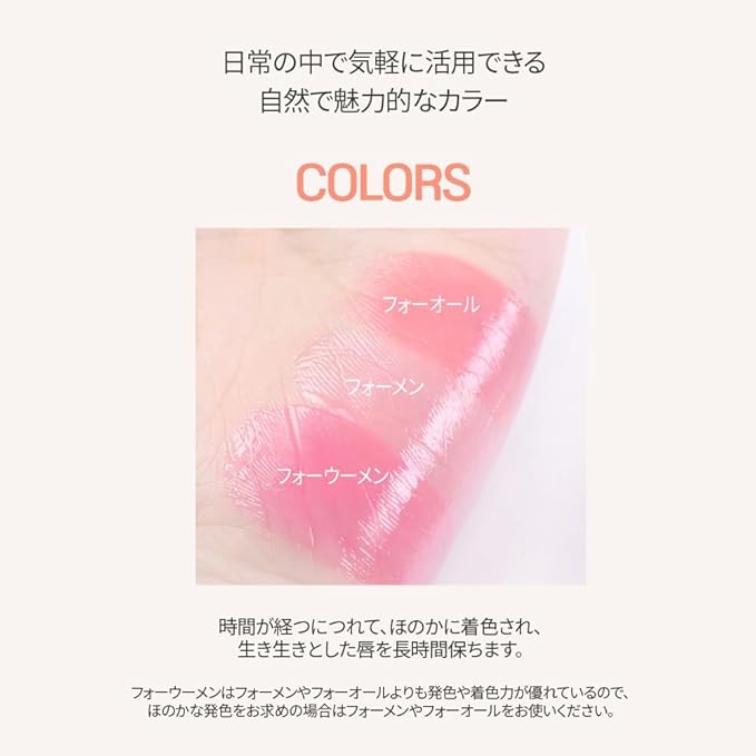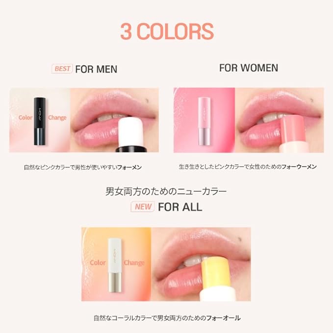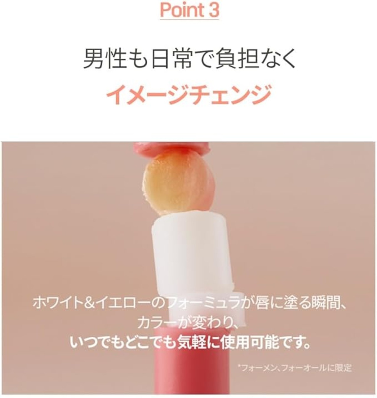 自然な血色と潤い: 唇に自然なピンクやコーラルカラーを与え、潤いを与えるリップバームです。