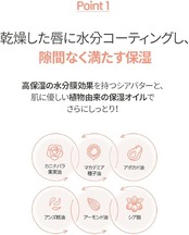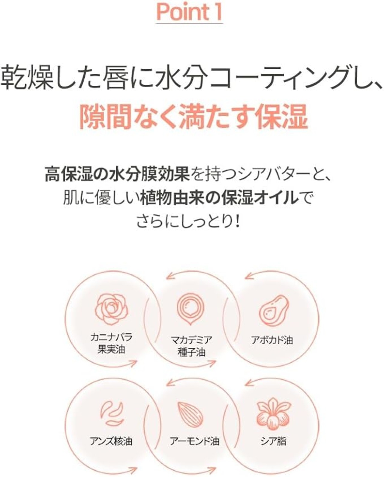 高保湿成分: シアバターや植物由来のオイル(カニナバラ果実油、マカデミア種子油など)を含み、乾燥した唇をしっかり保湿します。