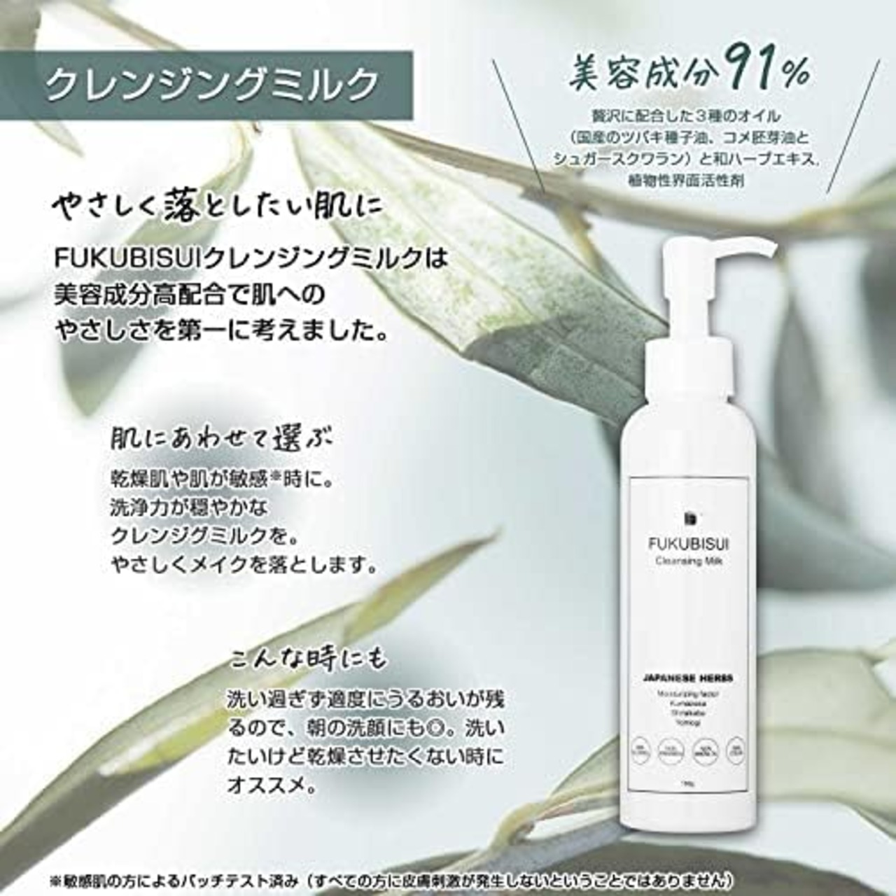 【福美水ならではの成分】成分はFUKUBISUIならではの日本人になじみ深い、和の植物(ヨモギ、シャクヤク根、チャ葉、アシタバ葉)を中心に、保湿作用の高い油脂類(ヒマシ油、メドウフォーム油、ホホバ種子油、ミツロウ、カルナバラロウ、キャンデリラロウ)も豊富に配合。みずみずしく潤う、和ハーブを贅沢に配合しました。