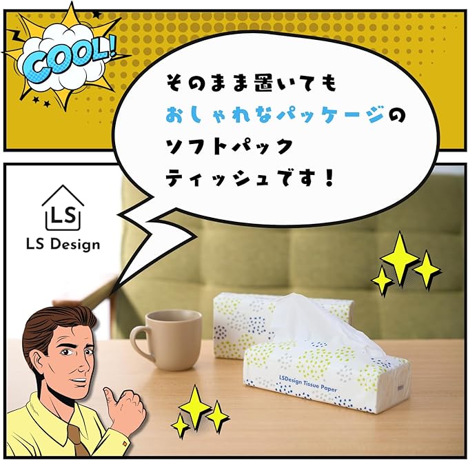 【特徴】箱をなくした省スペース設計のティッシュ ソフトパック。柔らかな質感で使いやすく、オフィスやご家庭の常備用にも最適です。一般的なティッシュペーパーやソフトティッシュと同様に、日常のあらゆるシーンでお使いいただけます。