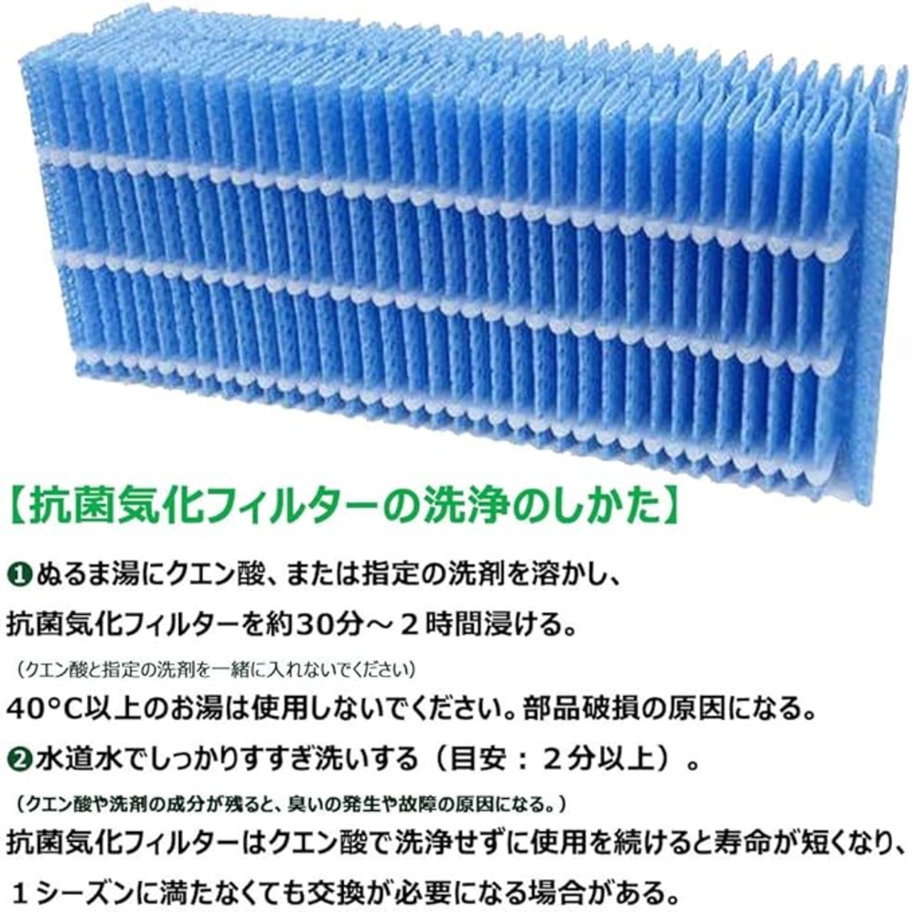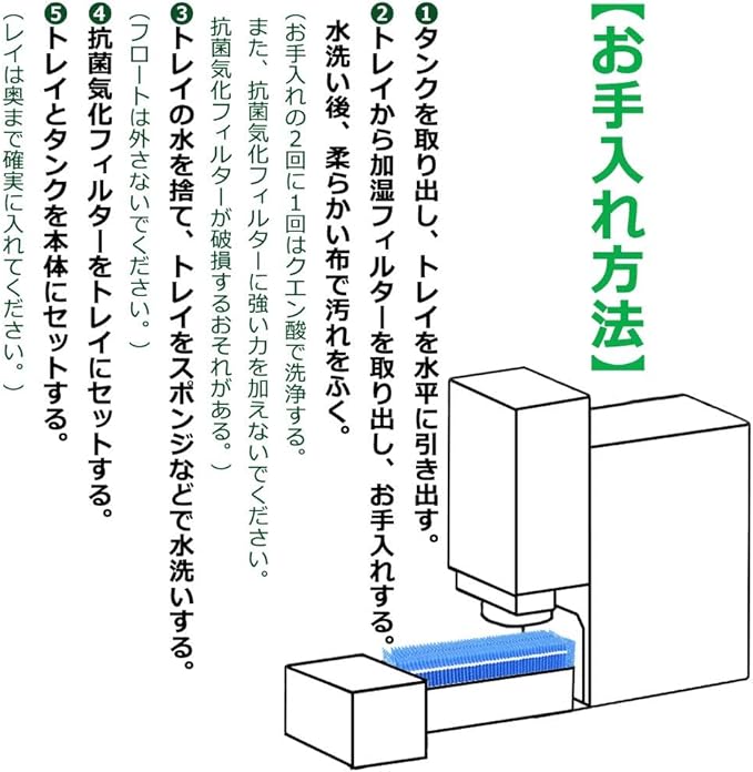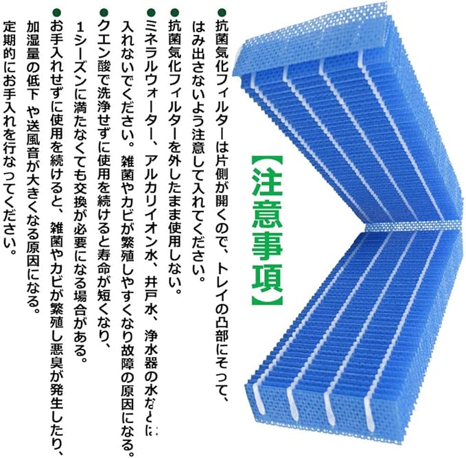 【お手入れの目安】1カ月に1回。また、5シーズンを目安に新しいものと交換してください。お手入れや交換をせずに使用を続けると、雑菌やカビが繁殖し悪臭が発生したり、加湿量の低下や送風音が大きくなる原因になる。