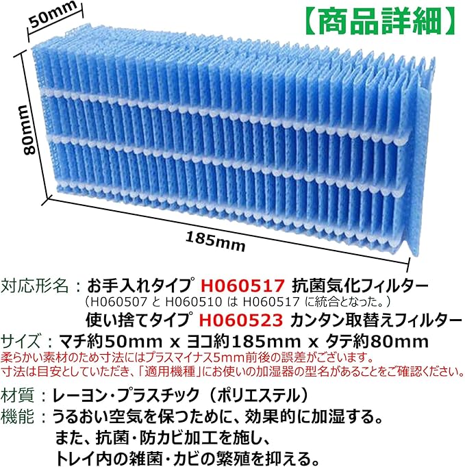 【形名】お手入れタイプ H060517 抗菌気化フィルター( H060507 と H060510 は H060517 に統合となった。)/ 使い捨てタイプ H060523 カンタン取替えフィルター 。材質:レーヨン・プラスチック。(柔らかい素材のため寸法にはプラスマイナス5mm前後の誤差がございます。 寸法は目安としていただき、「適用機種」にお使いの加湿器の型名があることをご確認ください。)