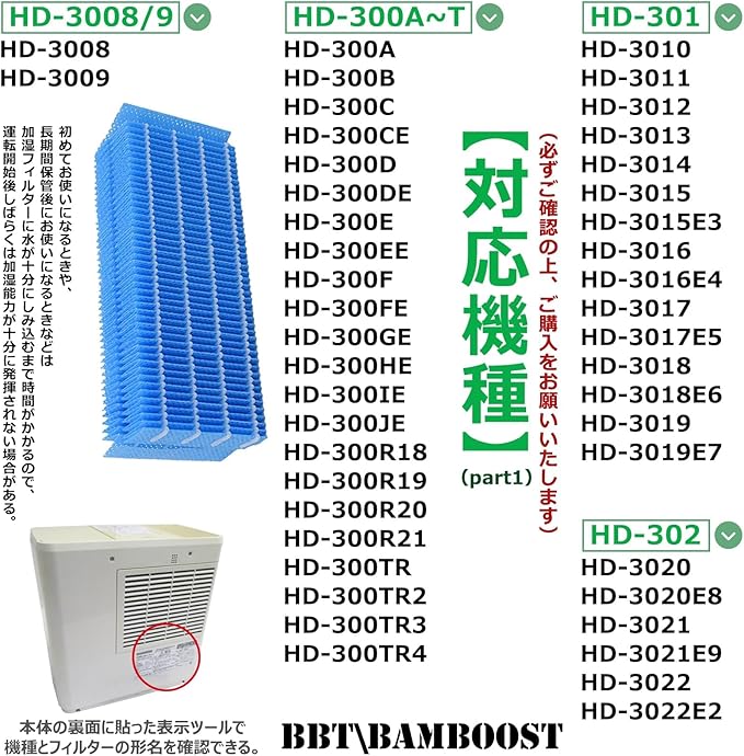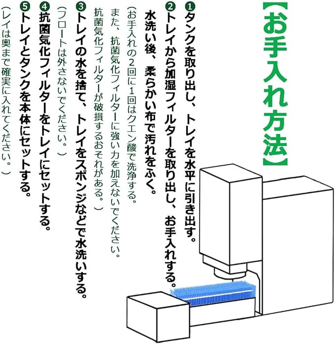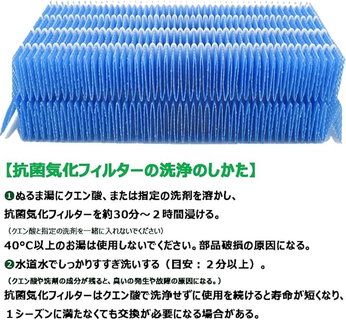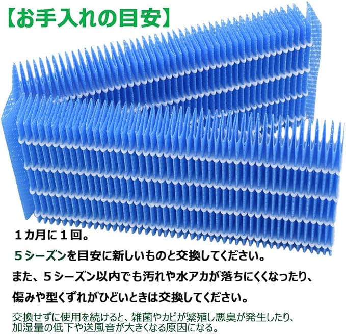 【お手入れの目安】1カ月に1回。また、5シーズンを目安に新しいものと交換してください。お手入れや交換をせずに使用を続けると、雑菌やカビが繁殖し悪臭が発生したり、加湿量の低下や送風音が大きくなる原因になる。