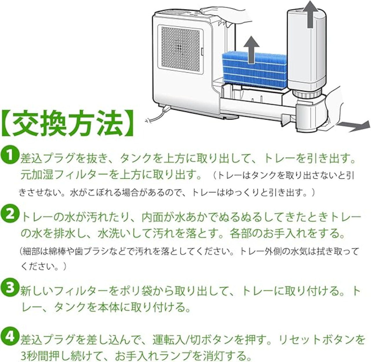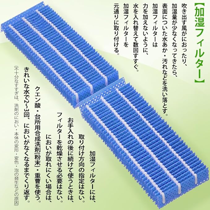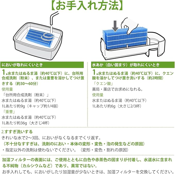【お手入れの目安】2週間に1回。お手入れしても、においがしたり加湿量が少ないときは、加湿フィルターを交換してください。