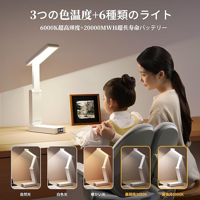 ️ 【3色調光、6段階の明るさ調整で】 ワンタッチで暖かい光(3000K)/自然光(4500K)/白く明るい光(6000K)の3色調光が可能。それぞれ6段階の明るさ調整で、学習机での勉強、読書、オフィスでの作業など、シーンにぴったりの光を簡単設定できるデスクライトです。