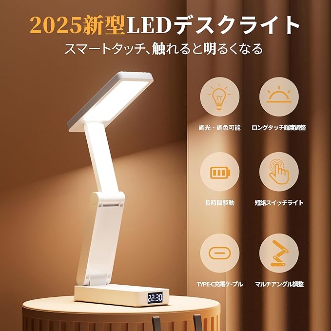 【折りたたみ式で省スペース】 折りたたみ式設計で収納時はコンパクトに。学習机やオフィスデスクを広々使えます。読書や仕事、オフィス、寝室用として、あらゆる生活シーンで活躍するコードレスデスクライトです。