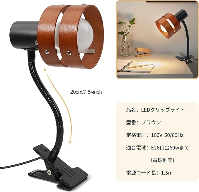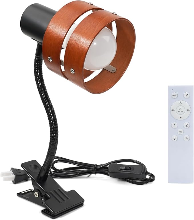 Aiwode クリップライト 茶色の木製の円 調光の電球 E26対応 360度回転 スイッチ付き リモコン対応 高級 調光調色 目に優しい 節電 省スペース設計 寝室 ベッドサイド デスクライト 読書用 高級レストラン照明 植物育成ライト対応 黒 1個