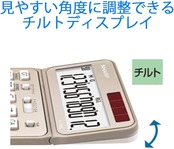 電卓50周年記念モデル。50周年のご愛顧に感謝しデザイン投票で選ばれたデザインを商品化。高級感のある仕上げにこだわったアルミパネルを採用。基本機能をきっちりおさえたナイスサイズタイプ