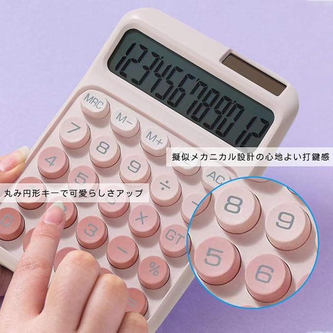 【電卓 かわいい 快適打鍵】丸みを帯びた可愛らしい円形キーを採用。擬似メカニカル設計による心地よい打鍵感と確かな押し応えで、長時間の入力作業でも指に優しい。デザイン性と操作性の両立を実現。