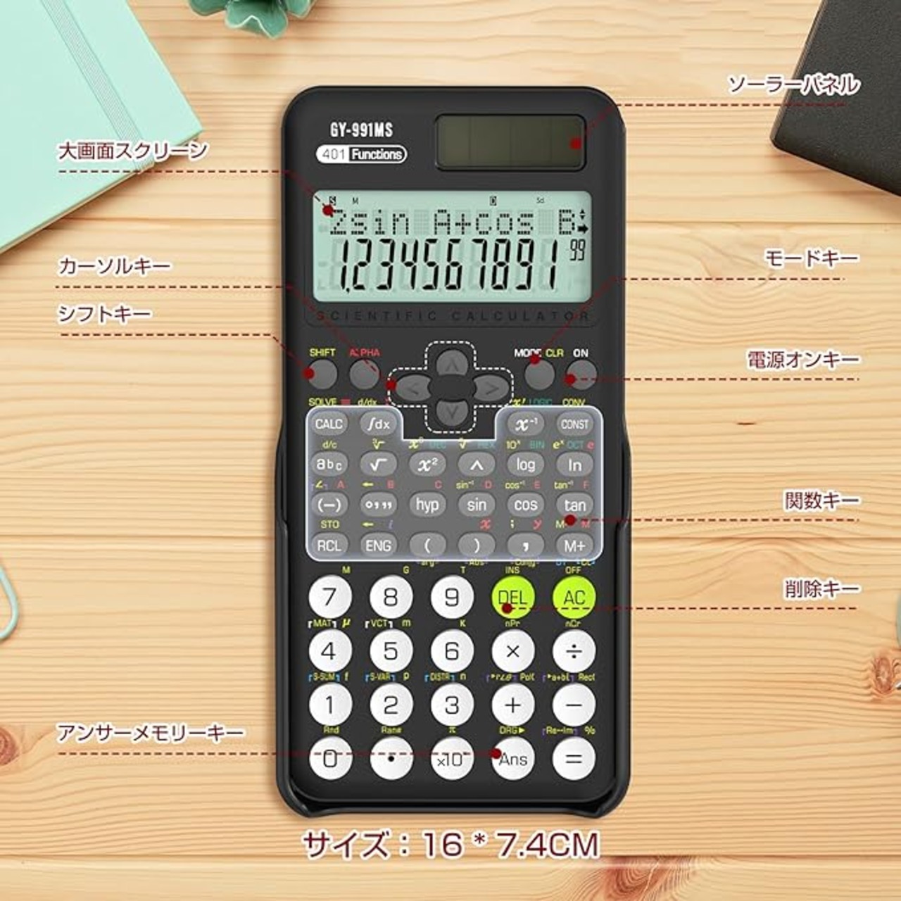 ①【多機能関数電卓】401関数・機能を扱う関数電卓です。基本計算から複雑な関数まで対応できます。数字も記号もはっきりと映され高精細な液晶ディスプレイも搭載します。電気・土木・建築系のお仕事に就いている方や、関数電卓が必要な理系大学生にぴったりです。多彩な関数機能で、学習から研究まで幅広く活躍します。