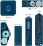 ハサミ・ホッチキス・修正テープ・テープのり・カッター・メジャーの6点が専用ケースにセットされています。