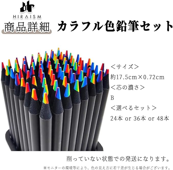 【商品内容】カラフル色鉛筆セット <サイズ>約17.5cm 0.72cm <芯の濃さ>B <選べるセット>24本or36本or48本 <備考>削っていない状態での発送になります。※モニターの環境等により、色の見え方に若干差が生じる場合がございます。