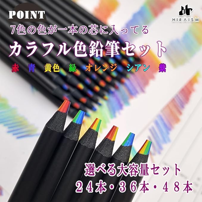 HIRAISM 虹色鉛筆 色鉛筆 カラフル レインボー 7色芯 B 多色 かわいい プレゼント 面白い文房具 (48本入り)