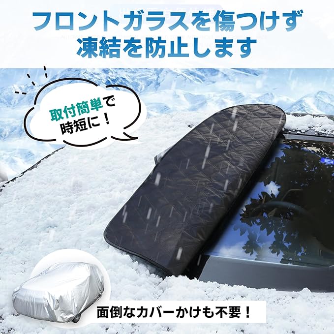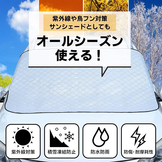 【オールシーズン保護】冬の雪・霜・凍結だけでなく、夏の紫外線・日差し対策(サンシェード効果)、雨・雹・落ち葉・鳥フンからも守る万能カバー。車内温度の上昇抑制にも役立ち、一年中使えるフロントガラス保護カバーです。
