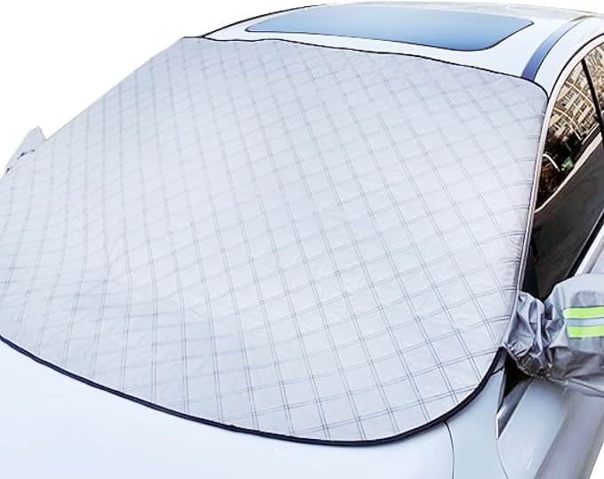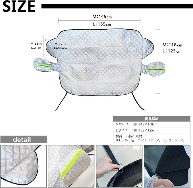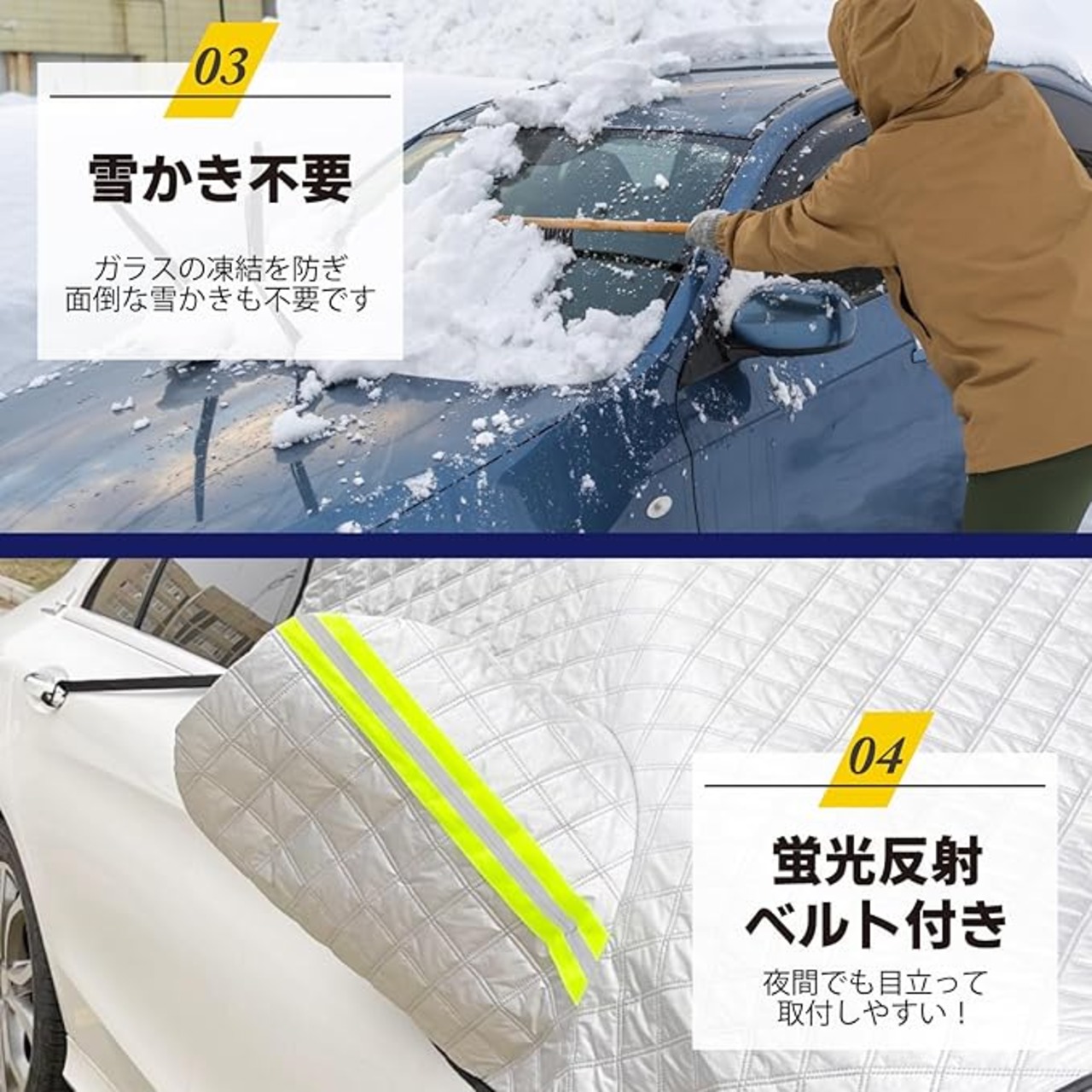 【凍結防止・雪対策】自動車のフロントガラスやサイドミラーに被せるだけで、霜取り不要・凍結防止ができる車用フロントガラスカバーです。PEVAアルミ箔+難燃素材+保温綿+PE不織布の厚手4層構造で、雪・霜・結露の付着をしっかりガード。防水・防寒・断熱性にも優れ、冬の凍結防止シートとして高い効果を発揮します。