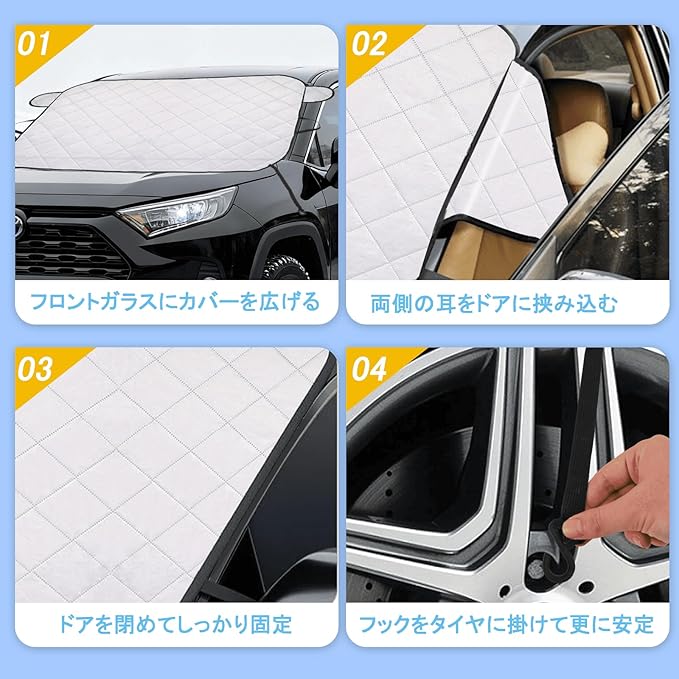 【簡単装着・強力固定】取り付けはわずか4ステップ。カバーを広げてフロントガラスに乗せ、ドアに耳部を挟み、車輪にフックを掛けるだけでしっかり固定できます。風に煽られにくく、長時間駐車でもズレにくい設計。毎日の使用でもストレスなく扱えるカーフロントカバーです。
