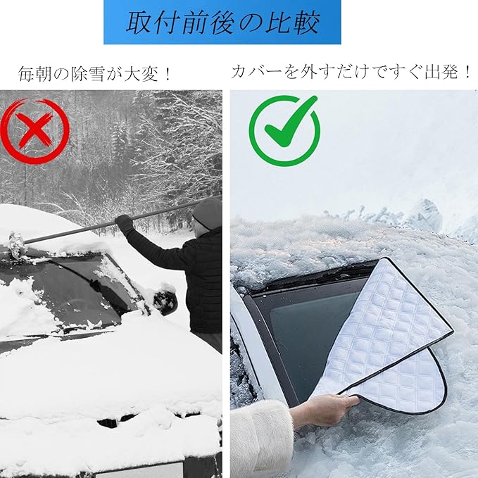 【凍結防止対策】:厚手素材を採用し、断熱性・防水性に優れています。車内の温度低下を軽減し、フロントガラスの凍結を効果的に防止。防雪カバーとしてだけでなく、霜や氷の付着も防ぐオールシーズン対応設計です。
