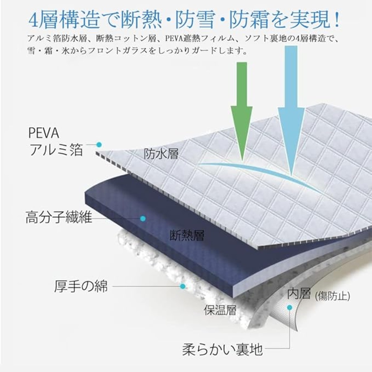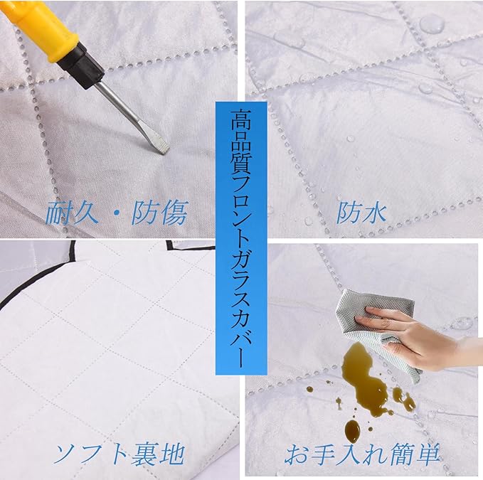【凍結防止対策】:厚手素材を採用し、断熱性・防水性に優れています。車内の温度低下を軽減し、フロントガラスの凍結を効果的に防止。防雪カバーとしてだけでなく、霜や氷の付着も防ぐオールシーズン対応設計です。
