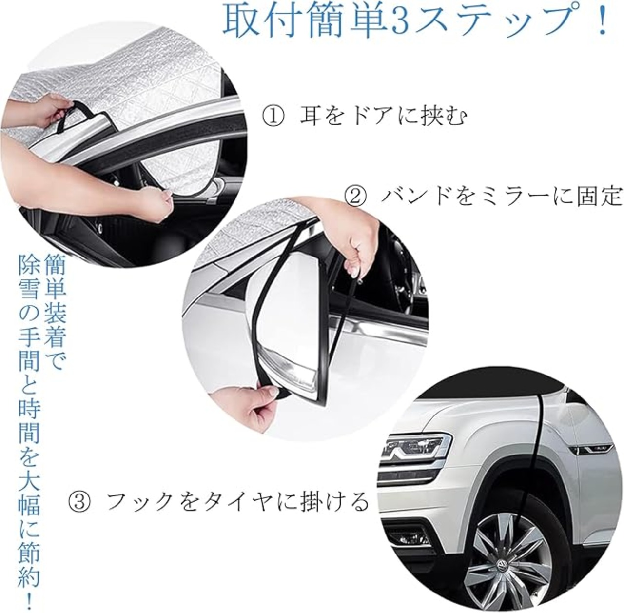 【折りたたみ式・収納袋付き】:使用後はコンパクトに折りたためる設計。専用の収納袋付きで、車内やトランクにスッキリ収納できます。冬の間だけでなく、夏の日除けカバーとしても便利なスノーカバーです。
