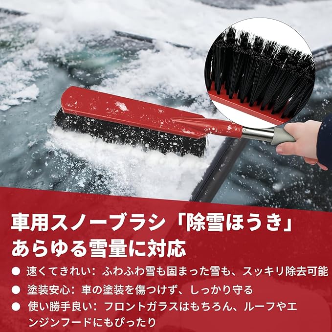スノーブラシ 2in1 除雪ほうき 雪かき スノースクレーパー 除雪ブラシ 収納袋付き 雪かき 除雪 除霜作業 車用 霜取り 軽量 一瞬でフロント復活 多機能 スノッキー(洗車・ベタ雪用) 自動車 トラック SUVに対応 全長61cm 持ち運びできる(レッド)